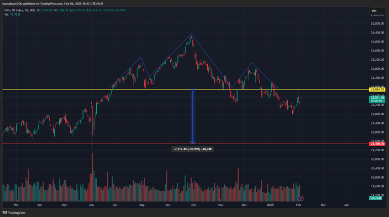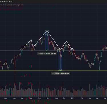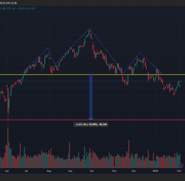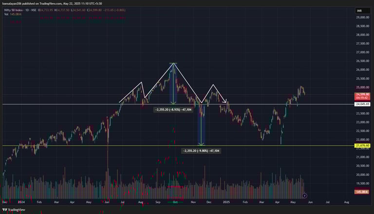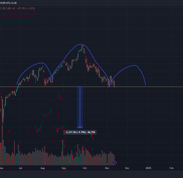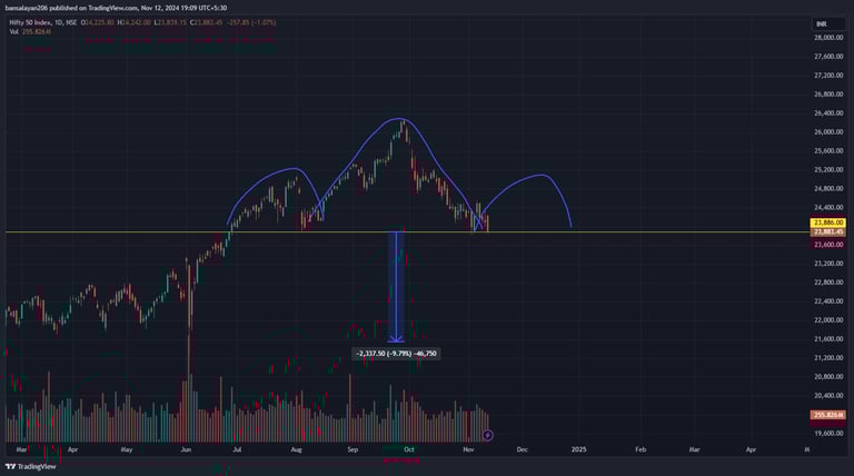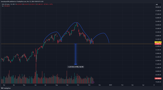 On November 12, 2024, I identified a potential Head and Shoulders pattern forming on the NIFTY 50 Index. This classic reversal pattern could signal a potential bearish move if the price broke below the neckline support. Based on technical projections, the ideal target was set at the depth of the head, marking a significant downside move.