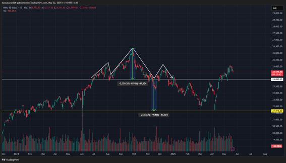 Projected Target: Based on the head’s depth, a breakdown could lead to a drop of approximately 10%, bringing NIFTY50 close to 21,600
