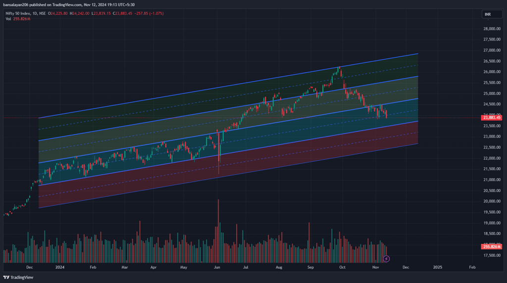 NIFTY had been trading in the blue channel from January, 2024 to the start of June, which was the election week. The price action was moving in an upward-sloping channel, indicating a sustained bullish trend. After breaking out of its blue channel it continued its bullish trend and made an all-time high of 26,200 (approx.) by the end of September, 2024. Since then, it has been in a correction phase and as on 12th November it had corrected by almost 10% and was trading near the lower boundary of the blue channel. I plotted different channels, representing varying levels of support and resistance.
