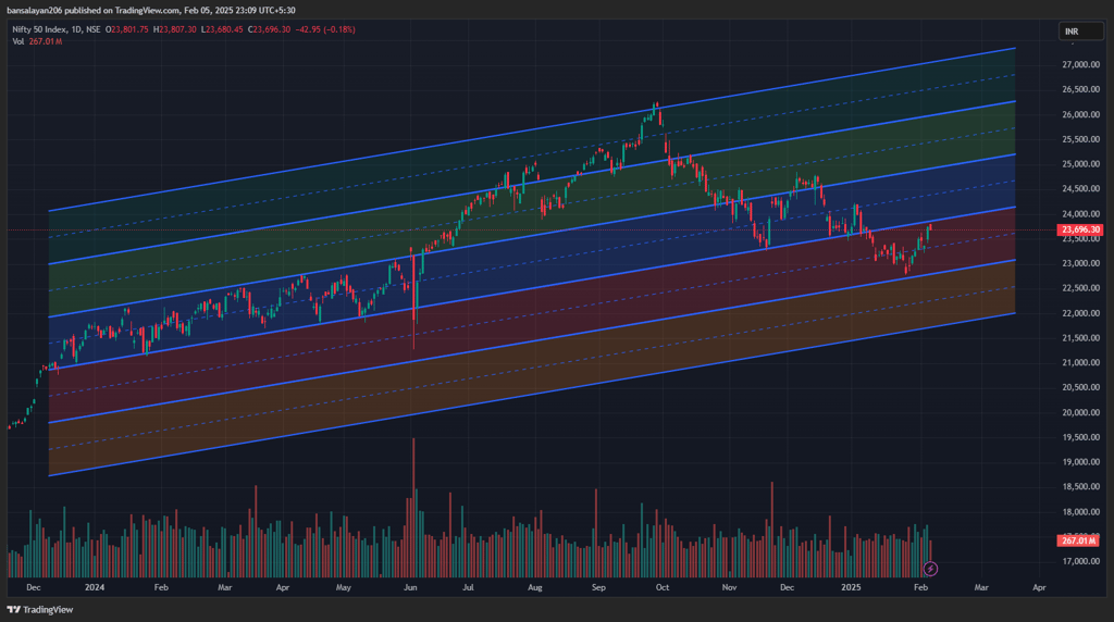 NIFTY’s price action has respected the support of the blue channel levels on two occasions after breaking down the third time in early January, 2025. After that it has tested the lower support level of the red channel and is now trading near the resistance level. As we move forward, it will be important to watch how NIFTY behaves around the upper and lower red channel limits. If the current trend holds, we could see a continuation toward higher levels, but if a breakdown occurs, towards the orange channel, a re-evaluation of the market structure will be necessary.